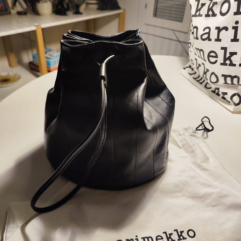 Marimekon paristi käytetty eli uudenveroinen Keira-laukku on valmistettu nahasta. Pyöreä laukku sulkeutuu olkahihnoja vetämällä. Sisäpuoli on vuoritettu ja siellä on yksi vetoketjutasku. Viininpunainen/ruskea.