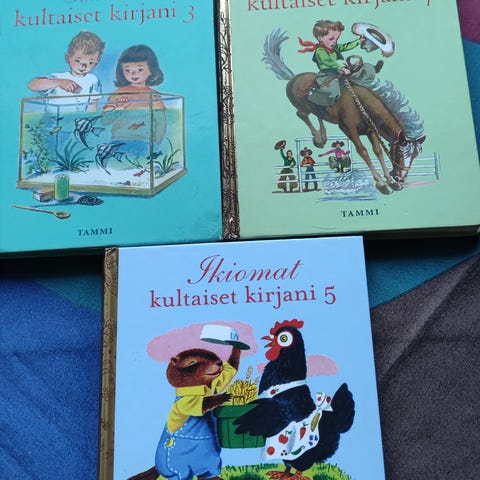 Kuvissa on useita vanhempia, kovakantisia lastenkirjoja, joissa on värikäs kuvitus. Kirjat ovat suomenkielisiä satukirjoja ja kertomuksia lapsille. (Tammi, Tammen kultaiset kirjat).