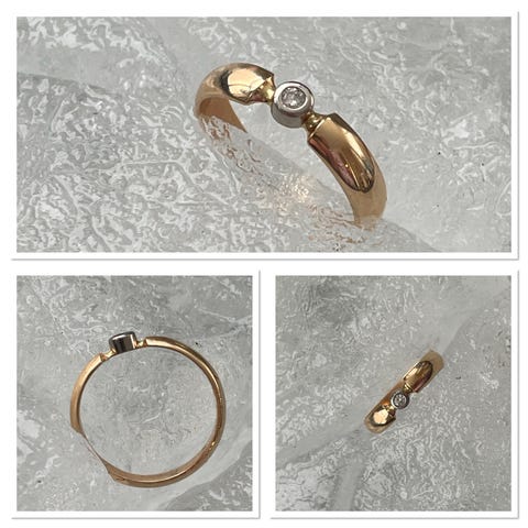 Sormuksessa on (585 KJ) leima. Se tarkoittaa, että kyseinen sormus on 14karaatin kultaa, sisältää 58,5% puhdasta kultaa + 41,5% hopeaa. Sormuksessa on 9 kpl 0,04ct timantteja & on erittäin näyttävä sekä sopii niin arkikäyttöön kuin vaikka vihkisormukseksi!