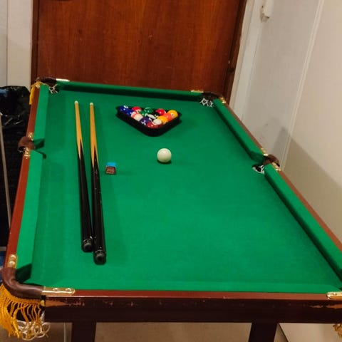 Biljardipöytä, jossa vihreä verka ja puunvärinen runko. Pöydän mukana näkyy olevan keppi sekä täydellinen setti palloja kolmion sisällä. Sopii sisäkäyttöön esimerkiksi pelihuoneeseen tai olohuoneeseen. Tarkat mitat, paino ja valmistaja eivät käy ilmi kuvasta.