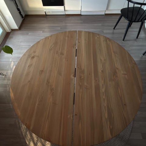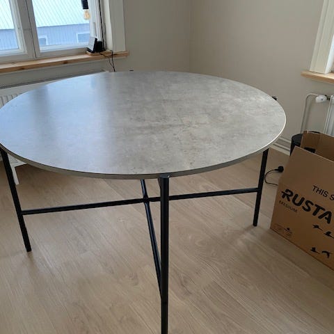 Pyöreä ruokapöytä lasikannella. Halkaisija 100 cm. Lasikansi on tummaa lasia ja se makaa metallijalkojen päällä. Lasikannessa on naarmu, jota on vaikea saada näkyviin kuvissa. Pöydän saa kahteen osaan (lasikansi + metallijalat) kuljetusta varten. Omat kantajat mukaan. Myös kotiinkuljetus onnistuu Vaasan alueella 30€ lisämaksua vastaan.
