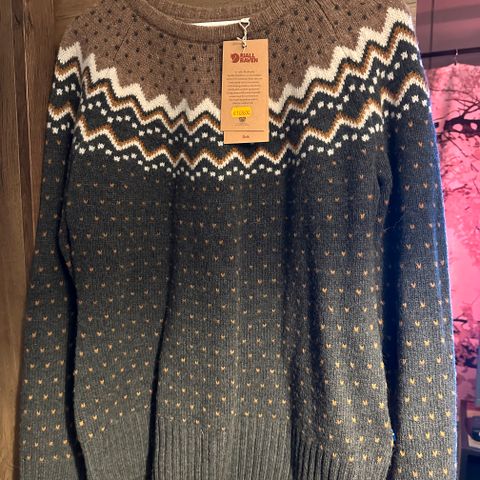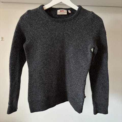 Fjällräven Övik villaneule. Alkuperäinen koko miesten XL, mutta otti pesussa sen verran osumaa, että vastaa naisten kokoa L. Ei ole huopunut, vaan edelleen pehmeä ja joustava, kutistui vain. Vahvistetut kyynärpäät, suora malli.