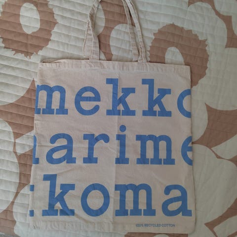 Vaaleanpunainen-valkoinen Marimekon kangaskassi. Kassi käyttöönottopesty, mutta jäänyt lopulta käyttämättä. Koiratalous. Nouto Ritaharjusta.
