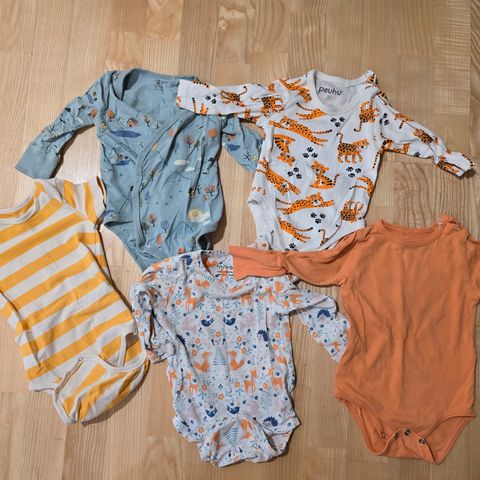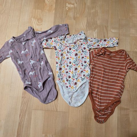6 kpl pitkähihaisia bodeja, 2 kpl lyhythihaisia bodeja ja 2 kpl paitoja. Hyviä 62 kokoa käyttävälle vauvalle.