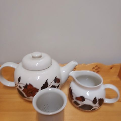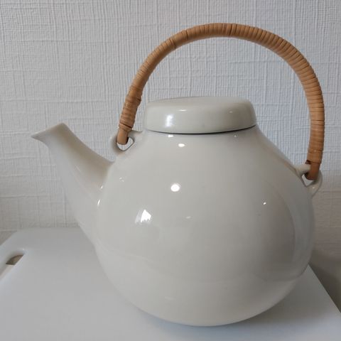 Arabian Suomessa 1970-luvulla valmistama, Gunvor Olin-Grönqvistin suunnittelema valkoinen, kannellinen teekannu Tea for Two, jossa on kansi ja irrotettava sihti. Teekannu on uudenveroinen, täysin ehjä, ollut vain kerran käytössä.
