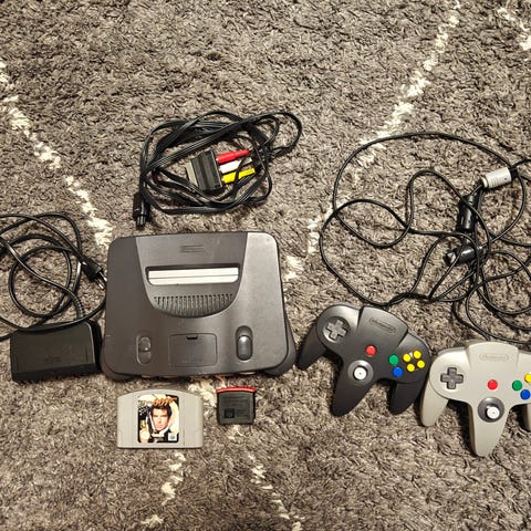 Nintendo 64 pelikonsoli. Mukana ohjain ja 6 peliä virtajohto ohjain ja rumble pak. AV Kaapelia ei tule mukana. Myyn myös erikseen