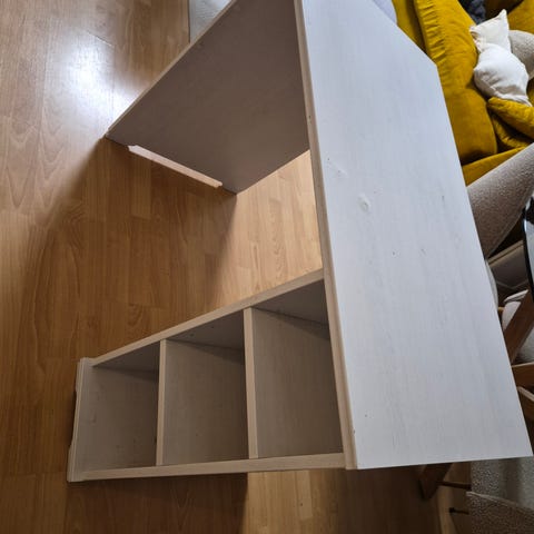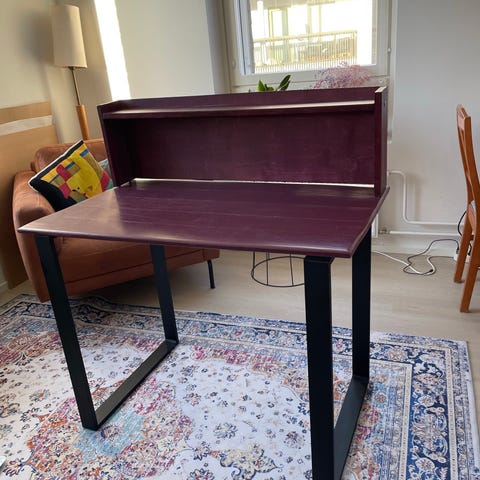 Hauska IKEA:n työpöytä. Pöydän vasemman puolen jalka irtaantui muutossa, ja se on korjattu L-raudalla sekä puuliimalla. Korjauksen myötä pöytä ei ole uudenveroinen, mutta toimii. Lisäksi pöydässä on käytön jälkiä punaisen pinnoitteen reunoissa. HUOM! Korjauksen vuoksi pöytää ei voi purkaa.