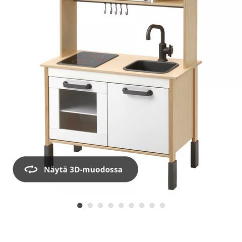 IKEA Duktig leikkikeittiö lapsille. Leikkikeittiössä on puunvärinen työtaso, valkoiset kaapit ja mustat yksityiskohdat. Varustukseen kuuluu liesitaso kahdella levyllä, allas ja hana, uunin luukku sekä säilytystilaa kaappien ja hyllyn muodossa. Yläosassa on lisäksi mikroaaltouunia muistuttava kaappi ja koukut keittiövälineiden ripustamiseen. Soveltuu lasten leikkikeittiöksi sisäkäyttöön.