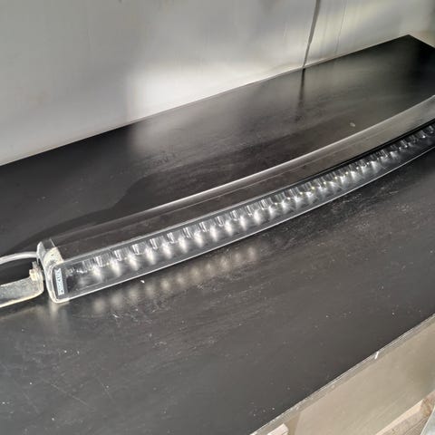 Purelux Black Boost C820 Gen1 kaareva lisävalo. 300W / Ref. 50. Ilmoitettu valoteho 7739 lm ja kantama 466 m (@ 1lux). Todella leveää valokeilaa kohtalaisella kantamalla. Päätykiinnikkeet puuttuu. Johto ja liitin ehjä.