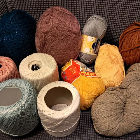 Sekalainen kasa lankoja. Pääasiassa villa- ja sekoitelankoja.
