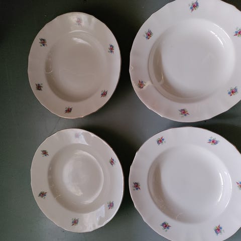 6 kplvArabia lautasia jossa vihreäsävyinen koristekuvio keskellä ja reunoilla. Materiaalina lasitepintainen keramiikka. Sopii kattaukseen ruokalautaseksi tai tarjoilulautaseksi. Pohjassa valmistajan Arabia-merkintä ja malli-/sarjatietoja leimassa.
