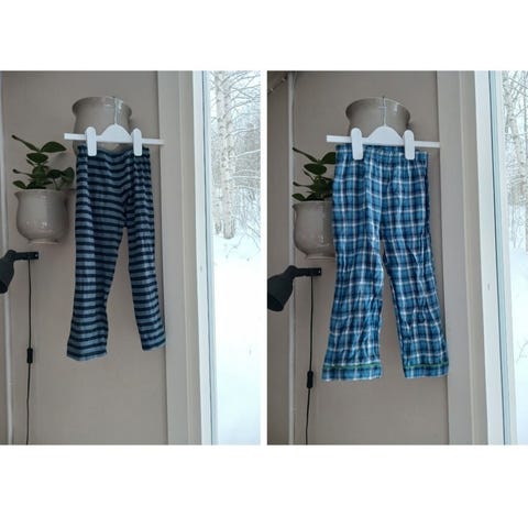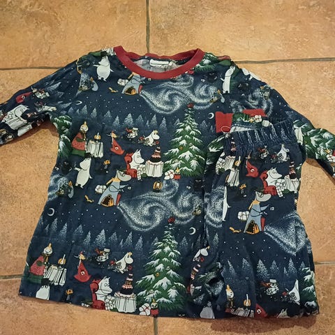 Muumi pitkähihainen pyjama, kokoa 98/104. Siistikuntoinen, aika vähän käytetty. Tummansiniset housut hieman haalistuneet, ei muuta mainittavaa.