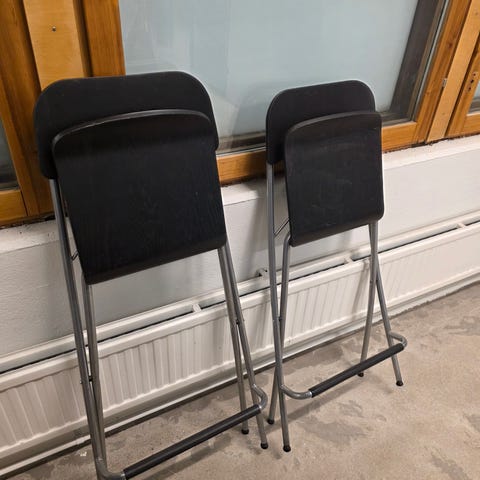 Säädettävät, pehmeät harmaat istumet, musta puu selkänoja ja metallinen runko.