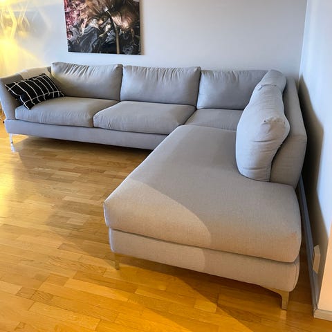 Todella laadukas sohva kaikinpuolin! Sopii olohuoneeseen tai oleskelutilaan. Väri on vaalea valkoinen ja sohva on sijoitettavissa nurkkaan tilan mukaan.