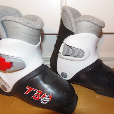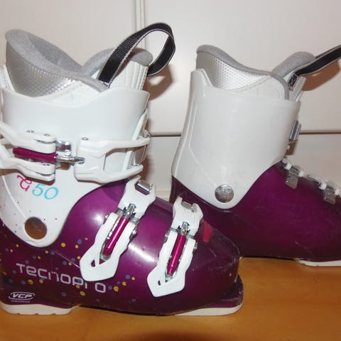Tecnopro T 50.2 laskettelumonot. Väri valkoinen punaisilla yksityiskohdilla. Kuoren pituus 243 mm, sopii siteisiin, jotka on säädettävissä tälle pohjanpituudelle. Kaksi solkea jalkaterän ja varren päällä. Soveltuu lasketteluun rinteissä. Merkitty brändilogo ja malli sivussa ja takana. Koko vastaa n. 32