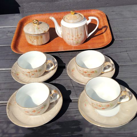Myydään käyttämätön pieni teesetti. Tarjottimessa hieman kulumaa. Kannun korkeus n 12cm. Tarjotin 25×25cm.