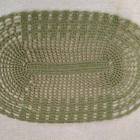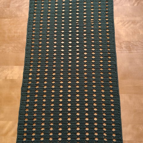 Uusi tummanvihreä käsin virkattu liina, koko n. 26 x 46 cm.