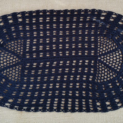 Uusi tummansininen käsin virkattu liina, koko n. 22 x 40 cm