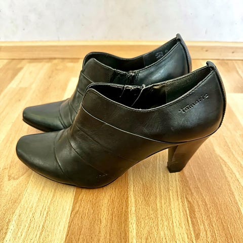Kerran käytetyt. Nahkaa. Vähän korkeat itselle kuitenkin. Muuten on kokoaan vastaavat.