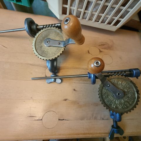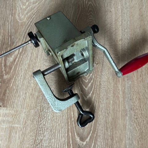 Mattson Moran käsikäyttöinen puolauslaite. Metallirunkoinen, kampikäyttöinen malli, jossa on hammaspyörävälitys ja puinen kahva. Laite kiinnitetään puristimella pöydän reunaan.