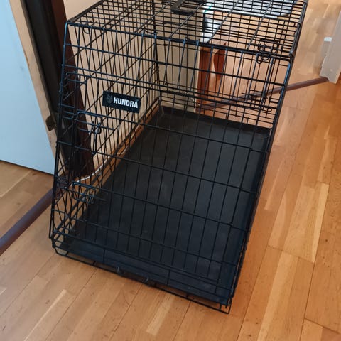 Kerran käytetty kuljetuskoppi johon mahtuu isokin koira. Mukana kaksi käyttämätöntä oveen kiinnitettävät ruoka/juomakulhot ja pikakiinnitettävät renkaat.