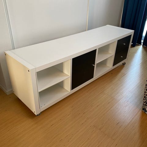 Valkoinen Kallax -hylly renkailla. Sisältää 2x hyllylokeron jakajaa.