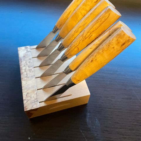 Iisakki Järvenpää Oy:n valmistamat teak-vartiset Hedelmäveitset/ Teline. Tehtaan tiedon mukaan teak oli veitsien materiaalina 1950/-60-luvuilla.Eikä mikään visakoivu !!!! Niin kuin monissa ilmoituksissa täällä väitetään. Veitsien terä on ruostumatonta terästä. Veitsen terässä on teksti: Iisakki Järvenpää Oy Ruostumaton. Yleisilmeeltään veitset ovat siistikuntoiset.