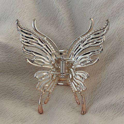Perhosaiheinen hiuskoru. Kokonaiskorkeus n.12,7cm. Perhoswn siipienväli n.2,7cm.