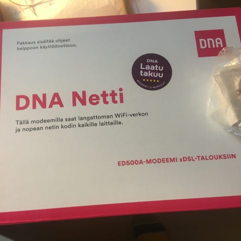 Tekoäly kertoo: DNA modeemi, väri valkoinen. Laitteessa on seinäkiinnitysmahdollisuus ja se toimii verkkovirtalähteellä, joka sisältyy mukaan. Soveltuu kiinteän laajakaistayhteyden jakamiseen kotiverkossa. Tarkemmat tekniset tiedot ja tuetut yhteystyypit löytyvät laitteen pohjassa olevasta tarrasta tai valmistajan ohjeista.