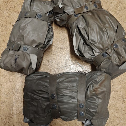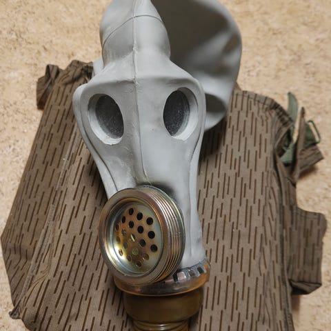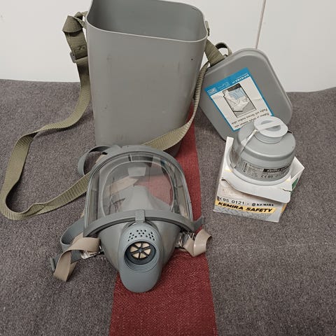 Setistä löytyy kaasunaamari, kumisrt hanskat, ja kaksi ydinlaskeumaviittaa.