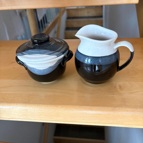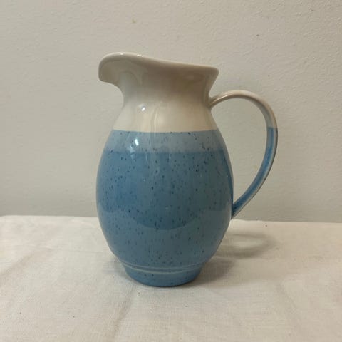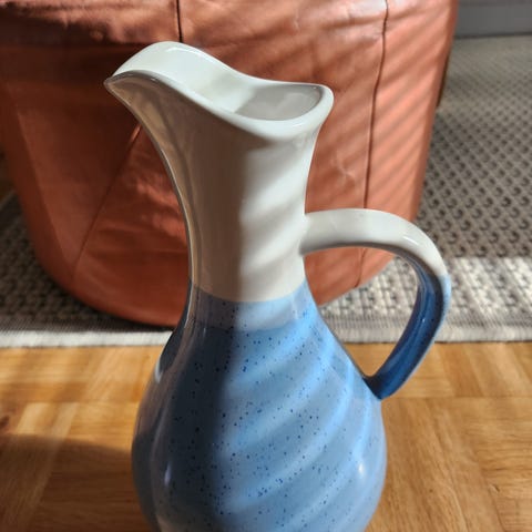 Vesikannussa on pieni halkeama lähellä yläosaa, mutta se ei vaikuta käyttöön (katso viimeinen kuva). Huomioitu hinnassa.
