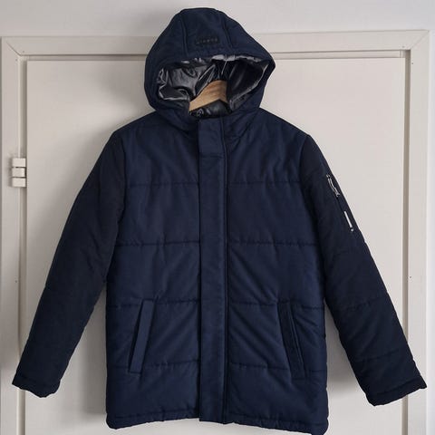 Creblet lasten talvitakki, koko 150. Väriltään harmaa sinisillä yksityiskohdilla. Takissa on vetoketjukiinnitys ja tarranauhallinen tuulilista, korkea kaulus sekä huppu. Hihansuissa on resorit sisäpuolella. Sopii unisex-käyttöön ulkoiluun ja talvikeleihin. Hyvässä kunnossa.