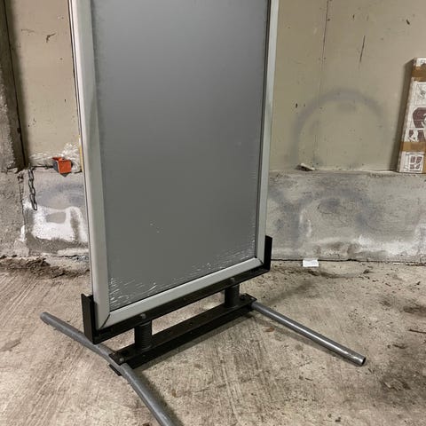Mainoskyltti jalustalla. Materiaalina alumiini tai alumiinikehys, väri hopea. Kaksipuolinen rakenne, jossa suorakulmainen kehys ja tukeva metallinen jalusta. Soveltuu esimerkiksi julisteiden tai ilmoitusten esillepanoon sisä- tai katettuihin tiloihin, kuten liikehuoneistoihin, toimistoihin tai aulatiloihin.