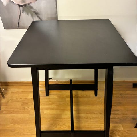 IKEA -kokonaisuus, johon kuuluu kaksi baarituolia ja kaksi pöytää. Baarituoleissa on valkoinen istuinosa, kromattu jalusta ja jalkatuki. Korkea baaripöytä on valkoinen, neliönmuotoinen ja siinä on metallinen jalka. Matalampi sohvapöytä on valkoinen, neliönmuotoinen ja siinä on metalliset jalat. Kokonaisuus soveltuu esimerkiksi keittiöön, ruokailutilaan tai oleskelutilaan.