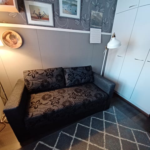 Harmaa levitettävä sohva. Sohva on painava joten suosittelemme omia kantajia.