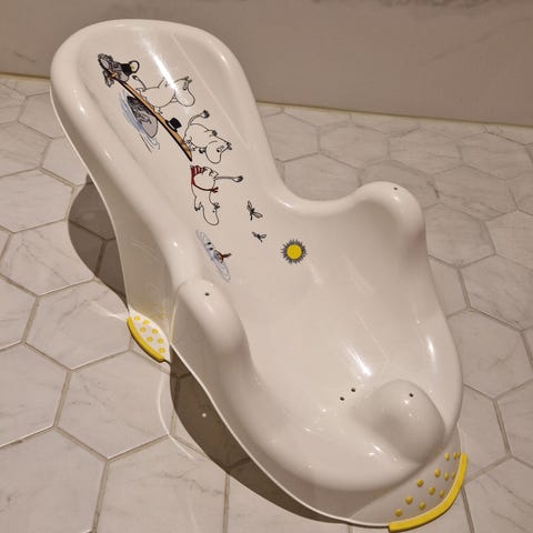 Vauvan kylpytuki kylpyammeeseen. Materiaalina muovi, väri valkoinen ja pinnassa muumien kuvia, pieniä käytönjälkiä löytyy. Ostettu uutena ja ollut kahdella lapsella käytössä.
