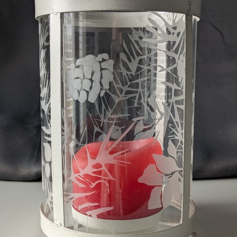 Lyhty on maalattua metallia ja sen sisällä on kynttilää tuulelta suojaava lasiosa.
