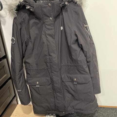 Ahkka naisten ulkotakki, koko 48. Väri harmaa. Hupussa on irroitettava tekoturkisreunus. Sopii ulkoiluun ja arkeen viileässä säässä.