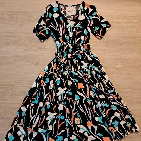 Kukallinen mekko, luultavasti jonkun itse tekemä. Koko M-L, sivussa vetskari. Hyvässä kunnossa, kangas on paksua ja jämäkkää.