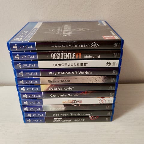 Myydään iso kokoelma Playstation 4 VR-pelejä joko yhdessä tai erikseen. Jos ei ole mainittu sanaa (käytetty), niin tuote on uusi ja muoveissa: