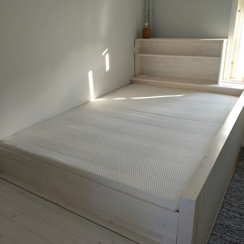 Joustinpatja. Vähällä käytöllä ollut, uutena meille ostettu. Takakankaassa kaksi pientä repeämää siirrossa tullut. Talossa villakoira joka ei ole patjalla kuitenkaan ollut.