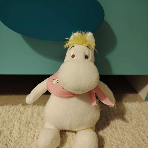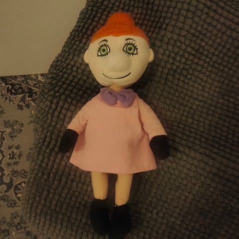 Muumiata tuttu Mymmeli pehmolelu, käsin virkattu nukke.