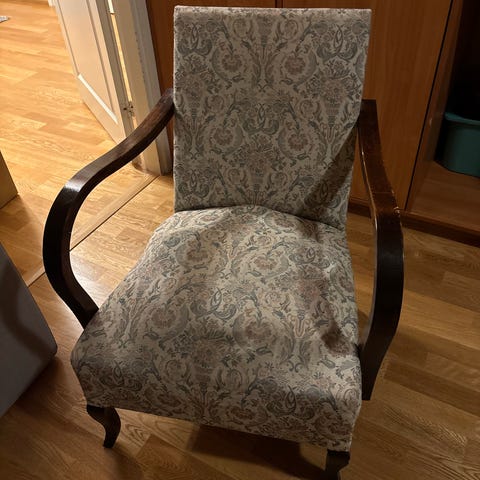 Siisti puinen lounge tuoli. Istuin osa hieman haalistunut/ kulunut ei näy merkittävästi. Istuimen reunassa pieni virhe puupinnassa. Kevyt, mutta tukeva istua.