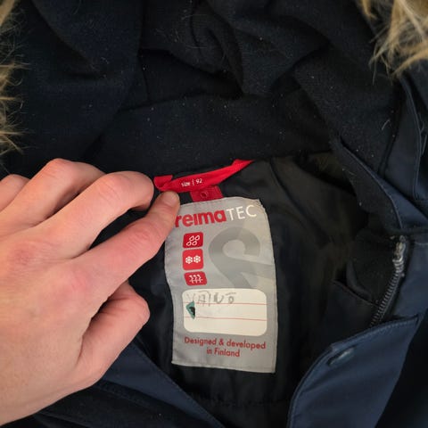 Reiman keltamusta talvihaalari, hyvässä kunnossa, vain lenksut puuttuu lahkeista mutta napit paikallaan.