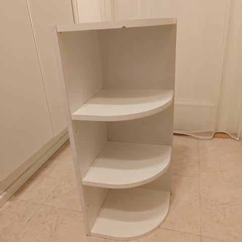 Vaalea ja siisti puinen kulmahylly usealla tasolla. Vie vähän tilaa ja sopii monenlaiseen sisustukseen.