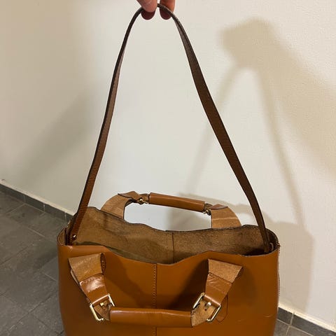 Nahkainen naisten olkalaukku OKEY'S. Laukku on ruskeaa nahkaa ja siinä on säädettävä olkahihna. Ulkopuolella on vetoketjutasku, ja sisäpuolella useita lokeroita ja vetoketjutasku pientavaroille. Vuori on kangasta. Sopii arkilaukuksi, johon mahtuu esimerkiksi lompakko, puhelin ja muut päivittäiset tavarat.