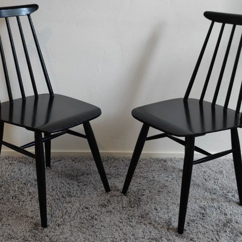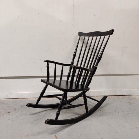 Komea korkealla selkänojalla varustettu 50-luvun musta keinutuoli myytävänä. Runko ja pinnat kaikki tukevia eikä tuoli kitku. Kuluneisuutta käsinojissa sekä jaloissa. Pinnoissa muutamia kolhuja.