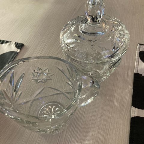 Kultareunuksinen kermakko sekä sokerikko ja kahvikuppi asetin kanssa