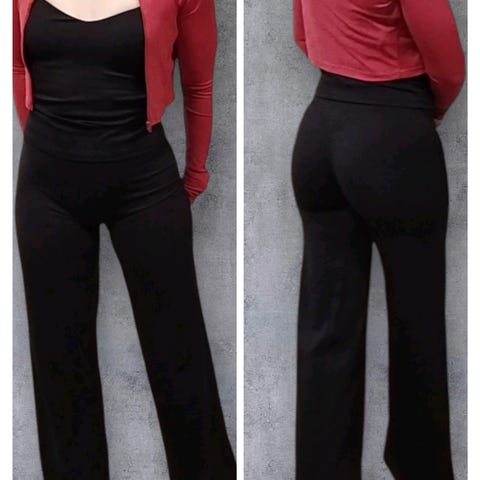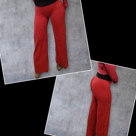 Tosi ihanat housut, hyvin laskeutuva melko paksuhko materiaali, levenevät lahkeet, scrunch sauma joka ei käytössä jää näkyviin