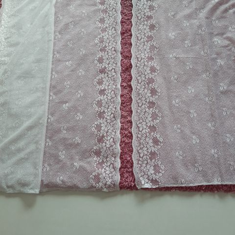 Käyttämättömät, ajattomat kukkakuvioiset pitsiverhot (2 kpl) rypytysnauhoilla.